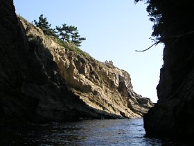 城ヶ島大橋の下をくぐり、城ヶ島へ。この島の南側の海岸は道路がなく、自然のままの砂浜が多いので、シーカヤックには最適なフィールドでした。観光スポットの馬の背洞門を見物して、東の灯台を回ってから、三浦半島の西岸を北上。