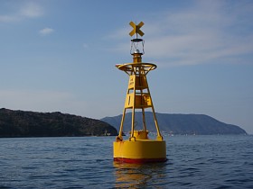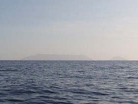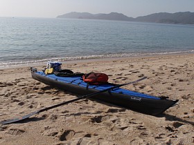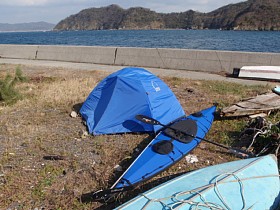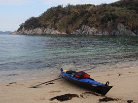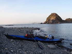 東京からの夜行バスで広島駅へ。郵便局でカヤックを受け取り、JRで光市へ移動し、スーパーで食料を調達し、虹ヶ浜海岸を出艇。初日は好天で、約15km先の祝島がくっきりと見えます。右下写真の、左が祝島、右が小祝島です。