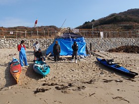 西端の岬を回り込むと、田ノ浦の浜が見えてきます。4年前と比べると、森の木々が広範囲に伐採されて、荒れた山の地肌がむき出しになっていました。浜では、現地で阻止行動をしている人達が迎えてくれました。ここで、虹のカヤック隊の原さんの他、意外な知人にも再会しました。