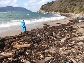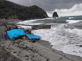 翌日は、さらに風が強くなり、風速18mの予報。朝、海岸に出てみると、浜のテントが波に流されて崩壊するところでした。ちょうど、満潮と強風が重なり、砂浜の奥まで波が押し寄せてきたのです。歩くのもままならない程の暴風の中、次々に流されて行くテントや物資を見ていると、妙にテンションが上がって、笑うしかない気分でした。