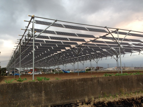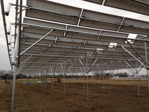 この下の畑では、榊の栽培をすることになっています。日陰を好む作物なので、遮光率は高めにして、約45%の設計になっています。これぐらい間隔が狭くなると、冬は前後のパネルで影ができないような角度にする必要があります。神栖は日照条件がいいので、発電量も期待できそうです。