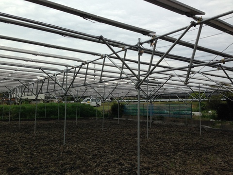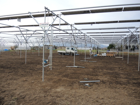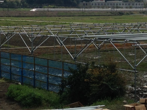 施主様は、有田のみかん農家さんで、こちらでの栽培作物は稲です。田圃の端に、竹がたくさん置いてあったので聞いてみると、1条バインダーで収穫して、はざかけで天日乾燥させているそうです。小規模な田圃は、通常、経済性としては厳しいと思いますが、ソーラーシェアリングによって利益を生む営農が可能となります。田植えが少々遅くなってしまいそうですが、無事に実りの秋になることを期待しています。ソーラーシェアリングの架台を使った、はざかけが見られるかもしれませんね。